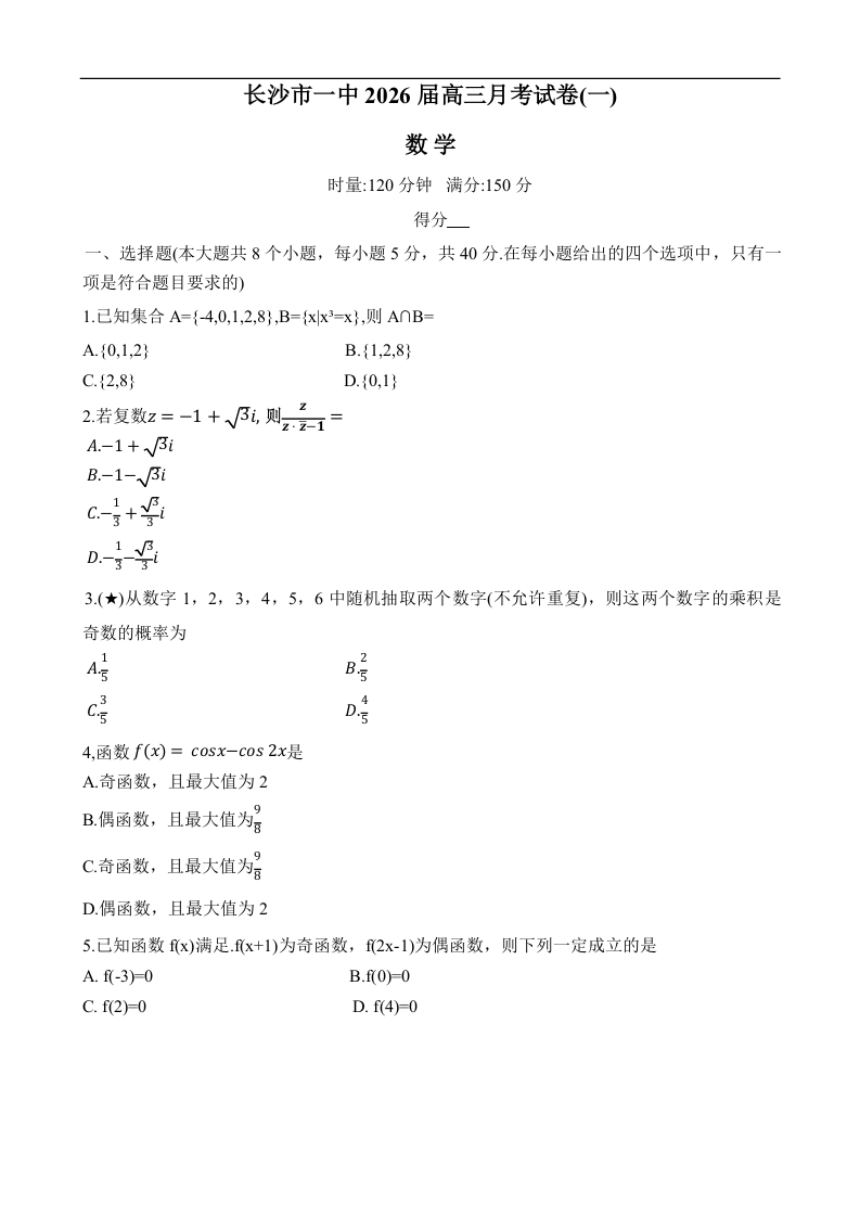 高三数学--湖南省长沙市第一中学2026届高三上学期月考(一)