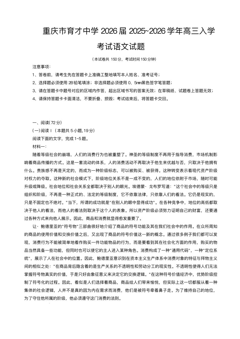 高三语文+答案--重庆西南大学附中、重庆育才中学2026届高三上学期入学联合诊断性考试