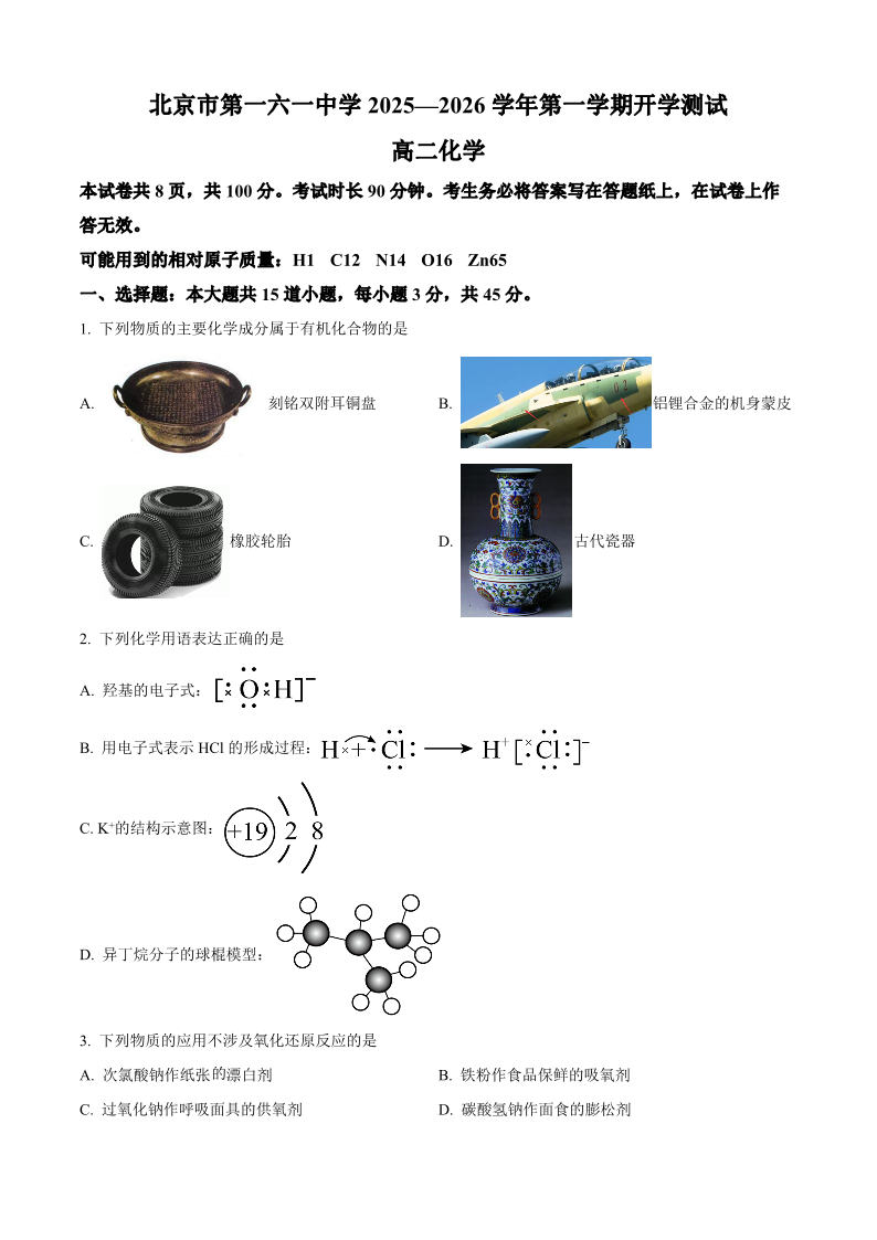 高二化学+答案--北京市第一六一中学2025-2026学年高二上学期开学测试