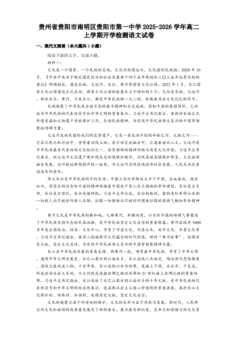 高二语文+答案--贵州省贵阳市第一中学2025-2026学年高二上学期开学考试