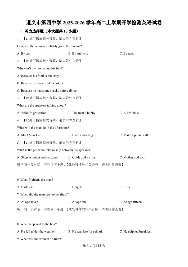 高二英语(原卷版)--贵州省贵阳市第一中学2025-2026学年高二上学期开学考试