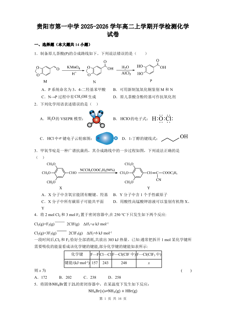 高二化学+答案--贵州省贵阳市第一中学2025-2026学年高二上学期开学考试