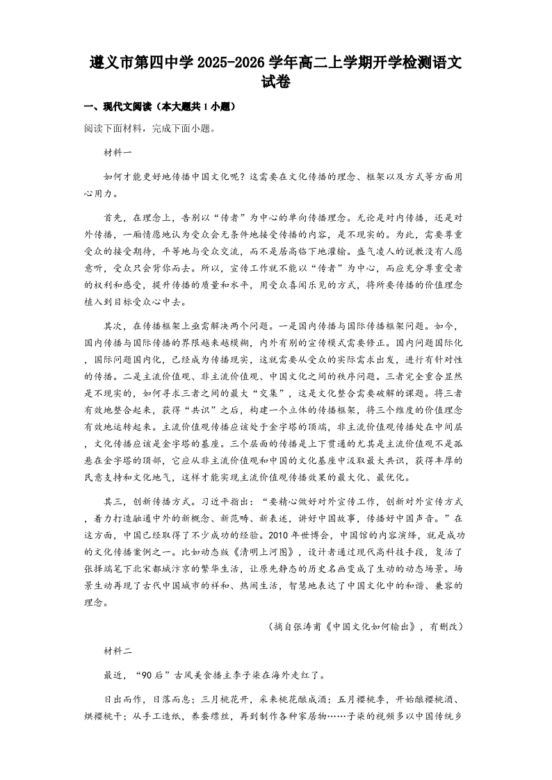 高二语文+答案--贵州省遵义市第四中学2025-2026学年高二上学期9月开学考试