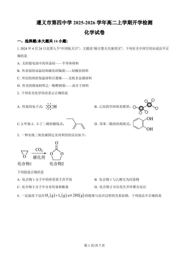 高二化学(原卷版)--贵州省遵义市第四中学2025-2026学年高二上学期9月开学考试