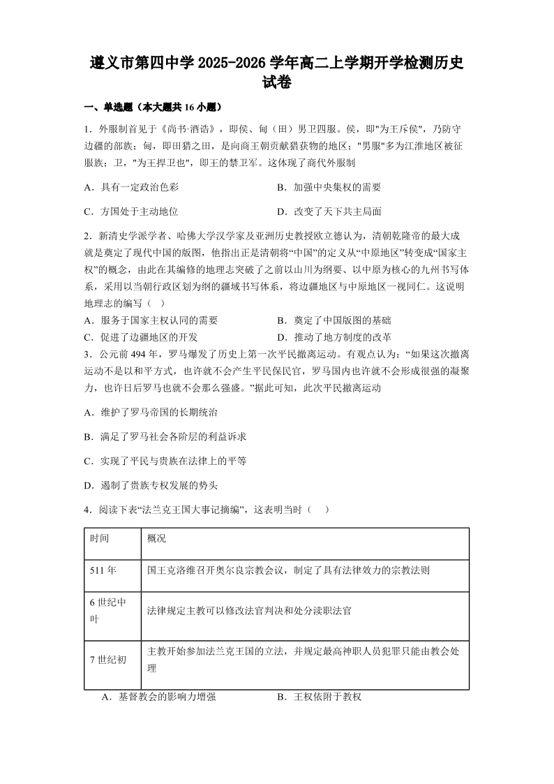 高二历史+答案--贵州省遵义市第四中学2025-2026学年高二上学期9月开学考试