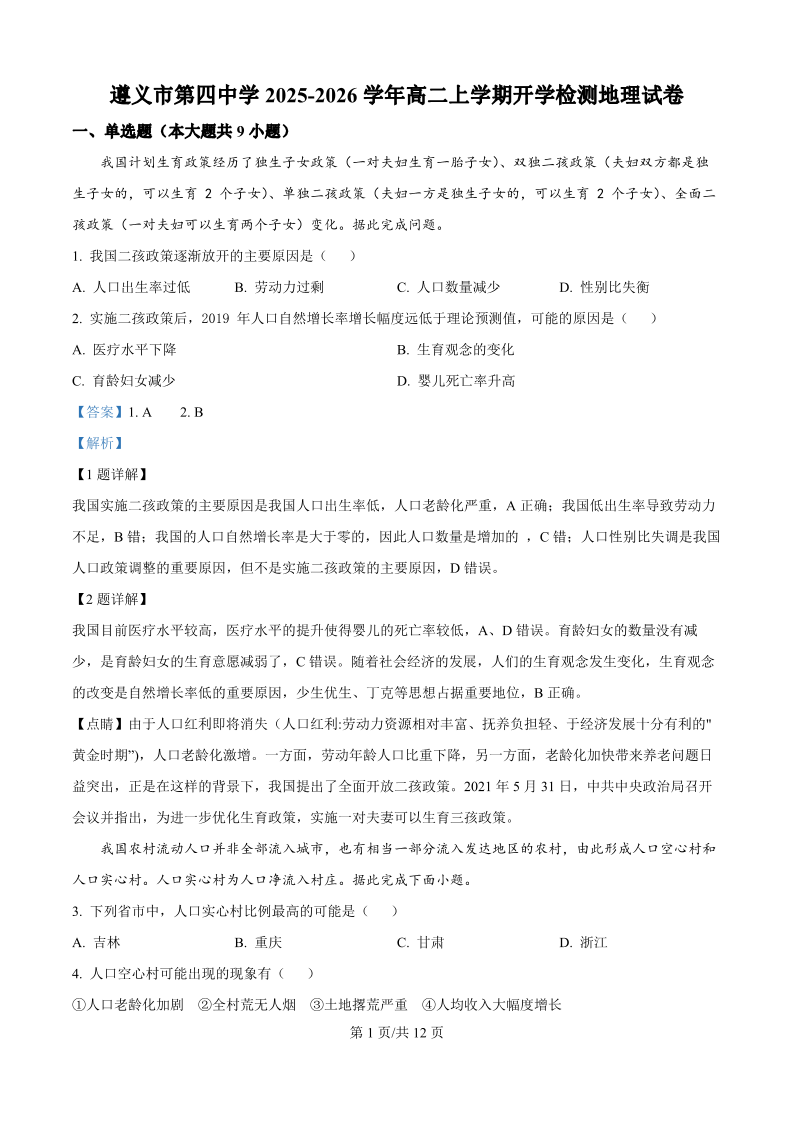高二地理(解析版)--贵州省遵义市第四中学2025-2026学年高二上学期9月开学考试