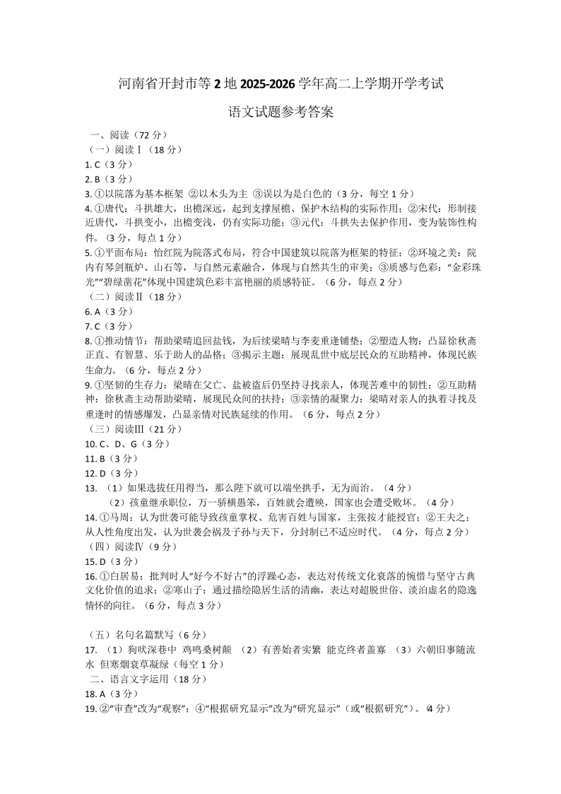 高二语文答案--河南省开封市等2地2025-2026学年高二上学期开学考试