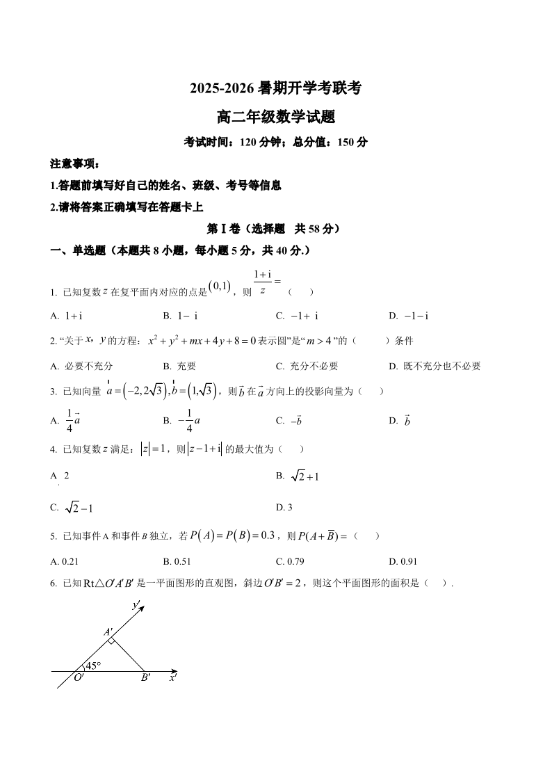 高二数学+答案--河南省开封市等2地2025-2026学年高二上学期开学考试