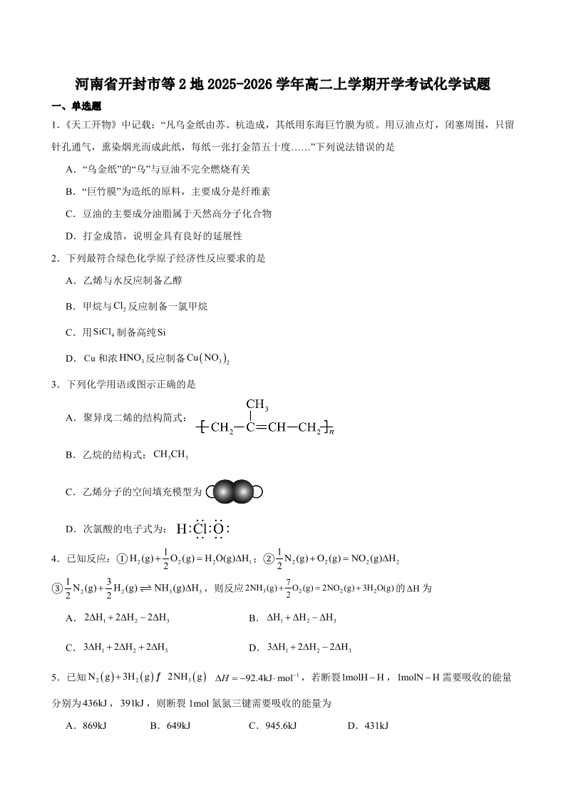 高二化学+答案--河南省开封市等2地2025-2026学年高二上学期开学考试