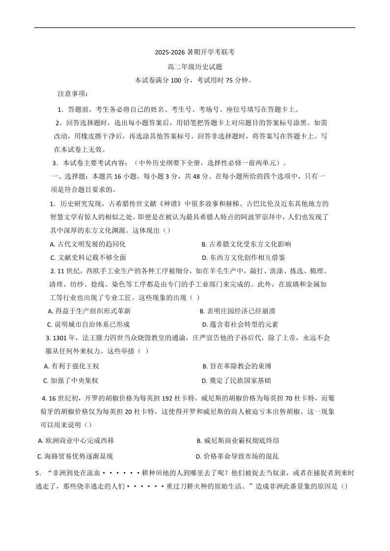 高二历史 +答案--河南省开封市等2地2025-2026学年高二上学期开学考试