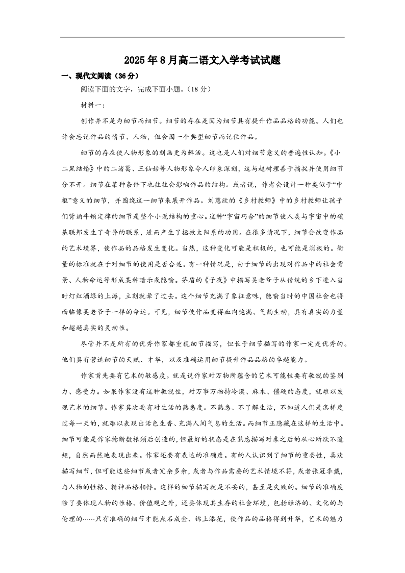 高二语文+答案--湖南省岳阳市汨罗市第二中学2025-2026学年高二上学期开学考试