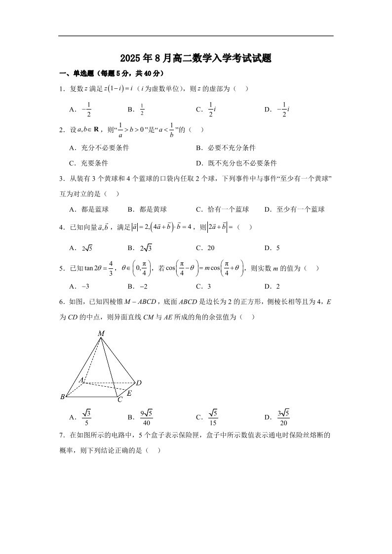高二数学+答案--湖南省岳阳市汨罗市第二中学2025-2026学年高二上学期开学考试