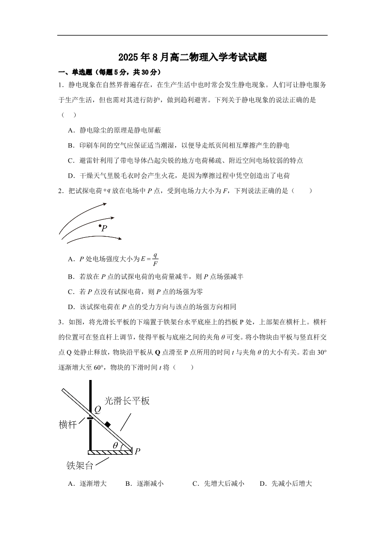 高二物理+答案--湖南省岳阳市汨罗市第二中学2025-2026学年高二上学期开学考试