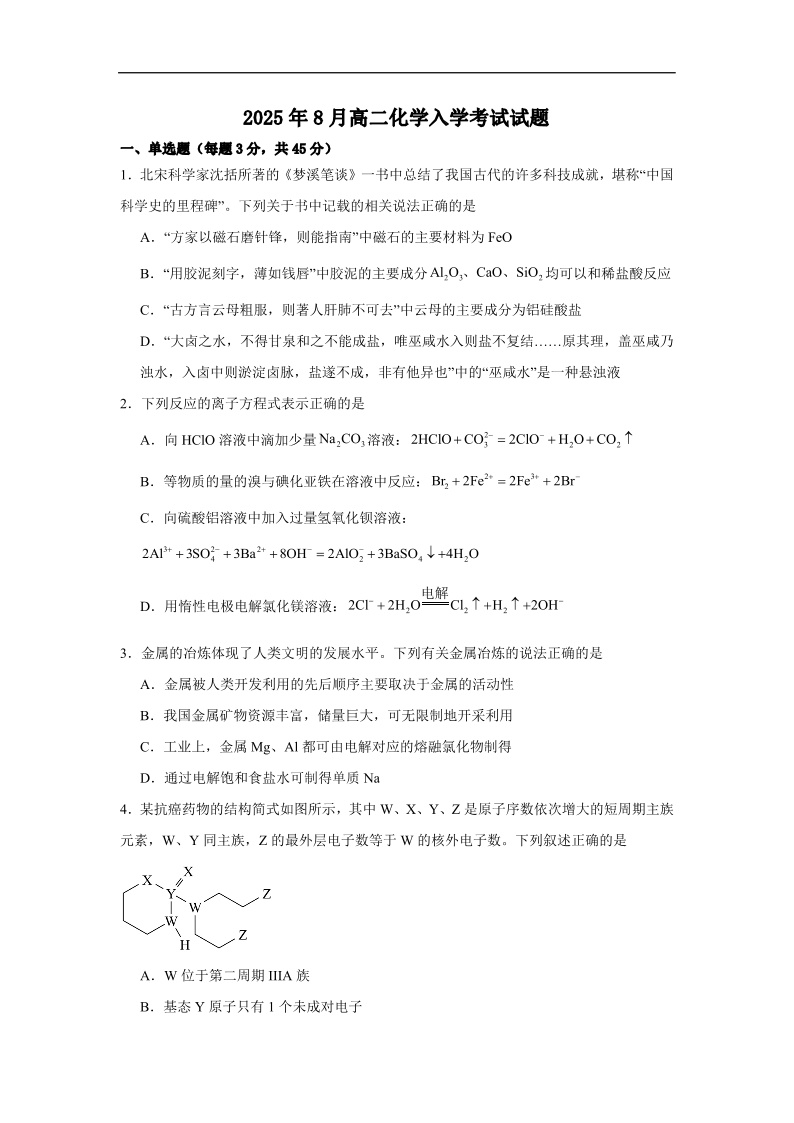 高二化学+答案--湖南省岳阳市汨罗市第二中学2025-2026学年高二上学期开学考试