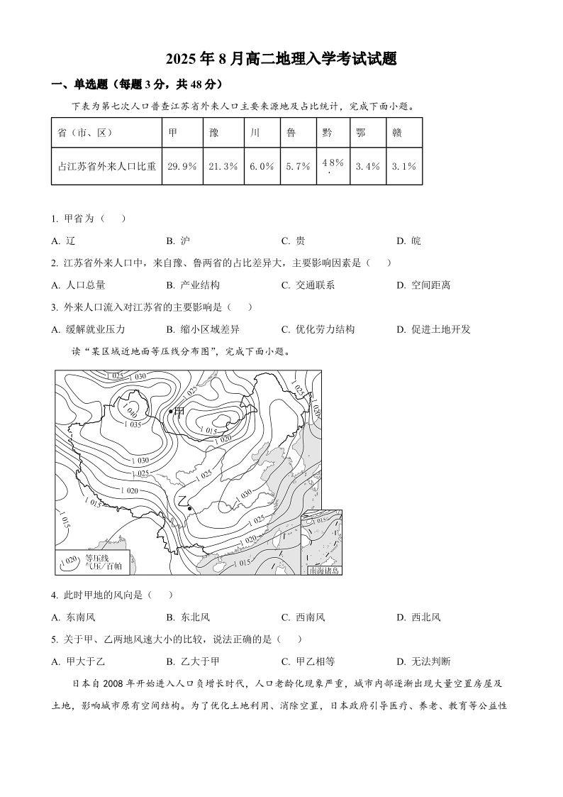高二地理+答案--湖南省岳阳市岳阳县第一中学2025-2026学年高二上学期开学考试