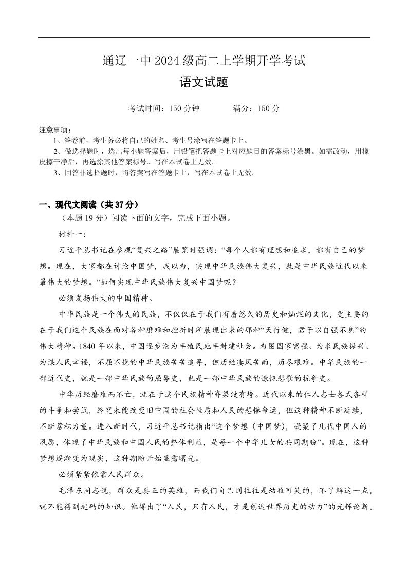 高二语文+答案--内蒙古通辽市第一中学2025-2026学年高二上学期开学考试