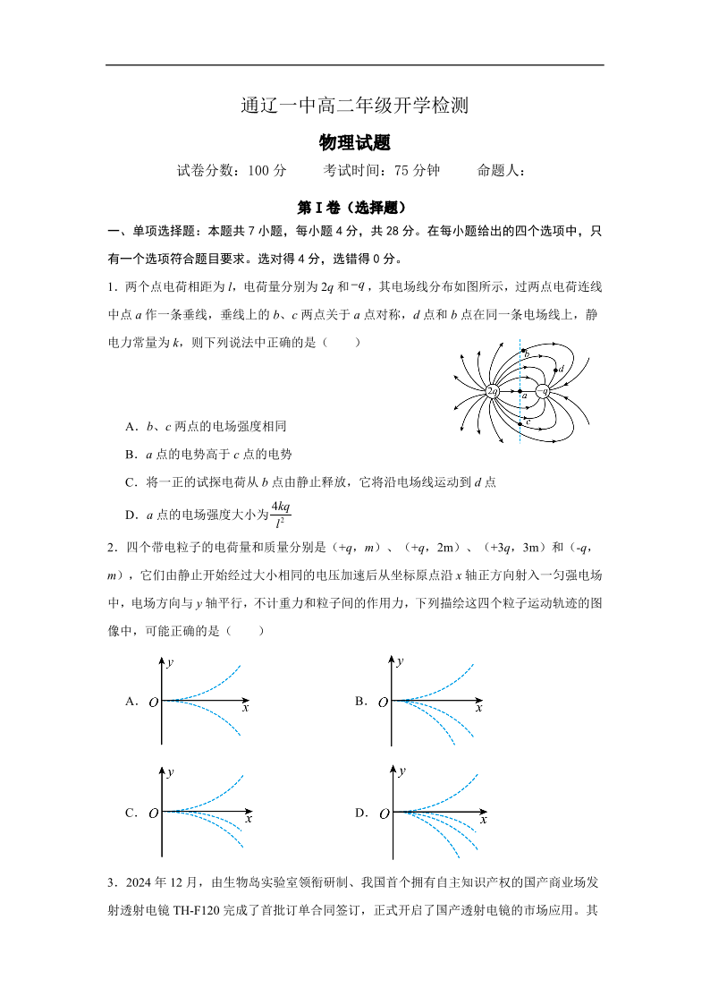 高二物理+答案--内蒙古通辽市第一中学2025-2026学年高二上学期开学考试