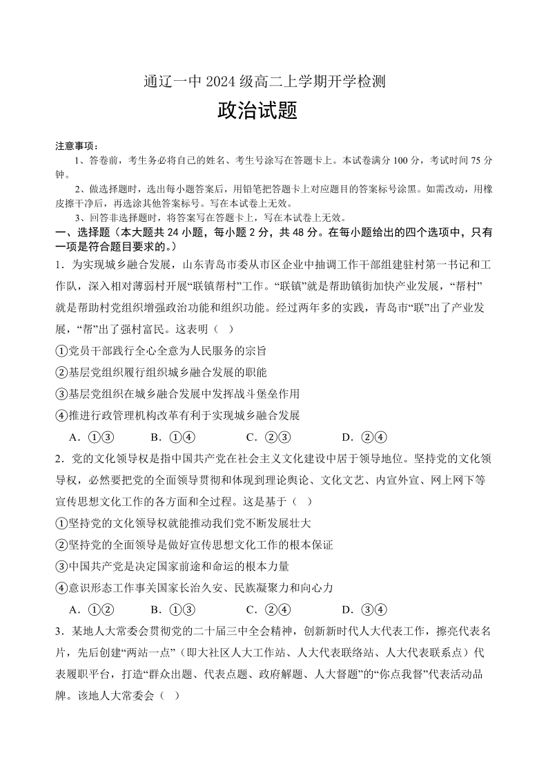 高二政治--内蒙古通辽市第一中学2025-2026学年高二上学期开学考试
