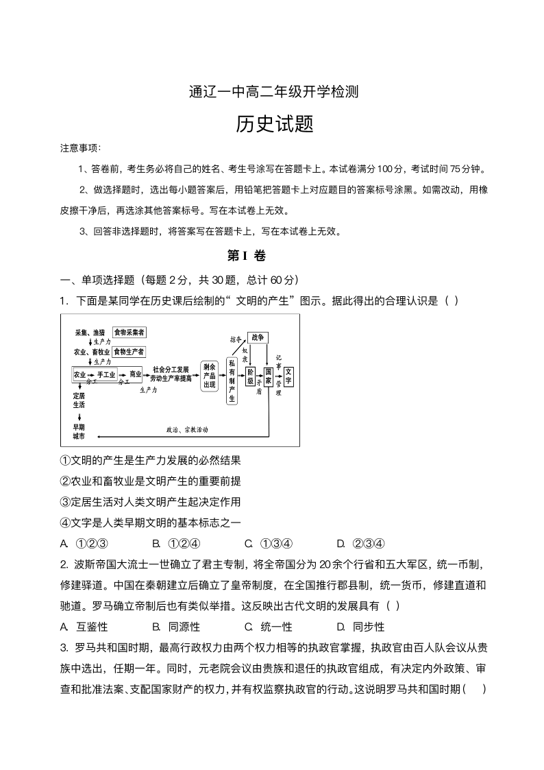 高二历史+答案--内蒙古通辽市第一中学2025-2026学年高二上学期开学考试