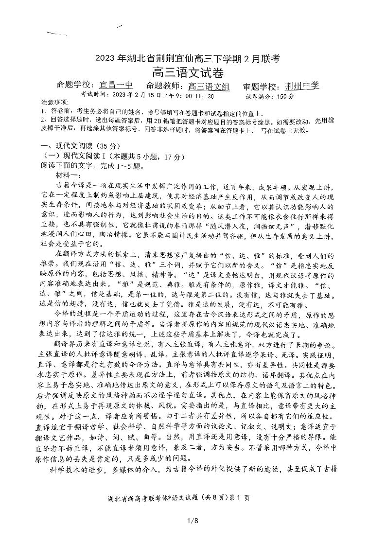 高三语文--湖北省新高考联考体2022-2023学年高三下学期2月联考