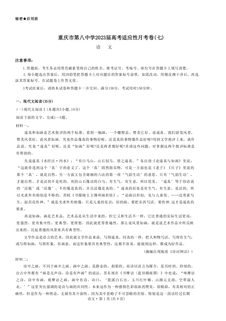 高三语文--重庆市第八中学高2023届高考适应性月考卷(七)
