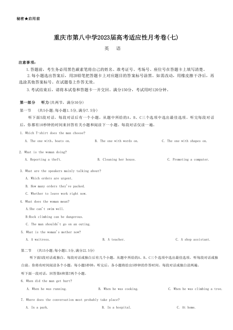 高三英语--重庆市第八中学高2023届高考适应性月考卷(七)