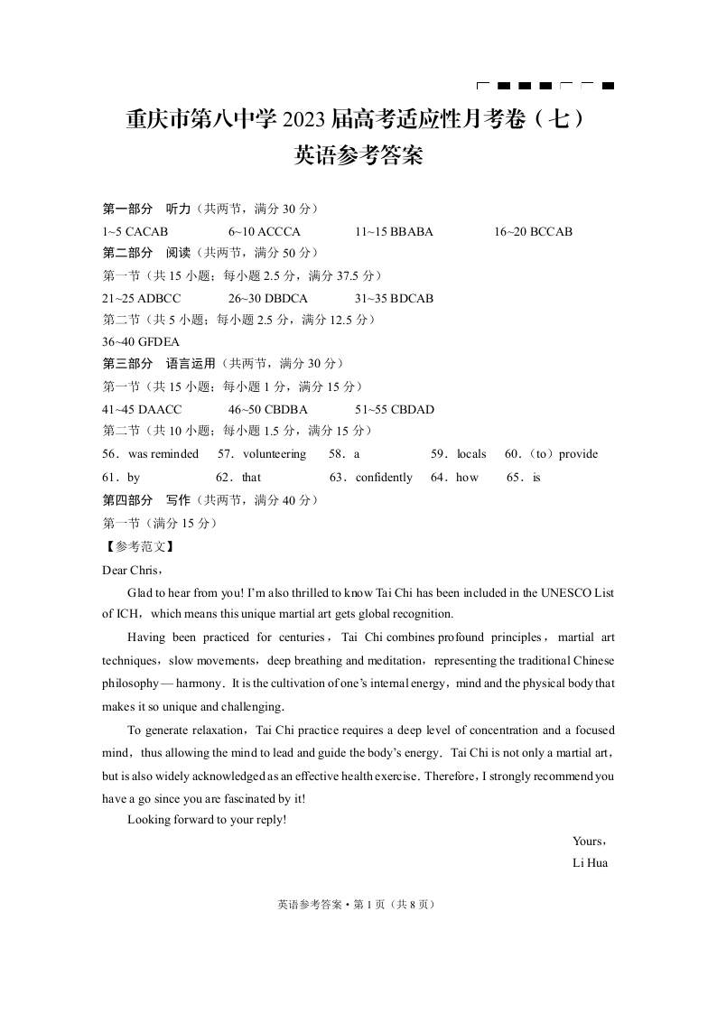 高三英语答案--重庆市第八中学高2023届高考适应性月考卷(七)