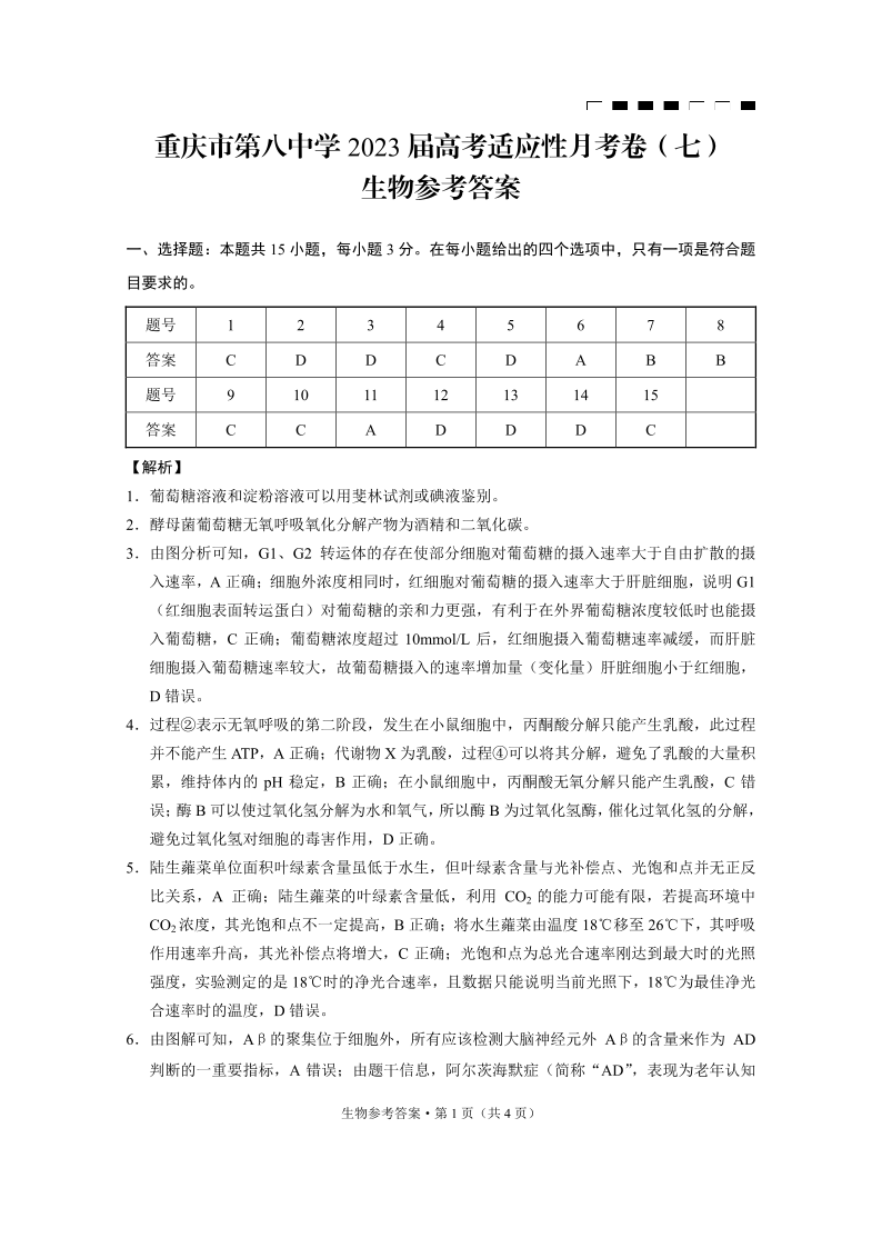 高三生物答案--重庆市第八中学高2023届高考适应性月考卷(七)
