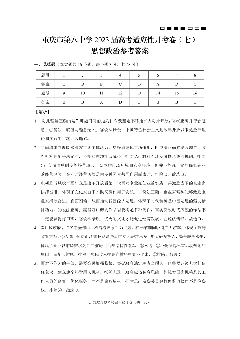 高三政治答案--重庆市第八中学高2023届高考适应性月考卷(七)