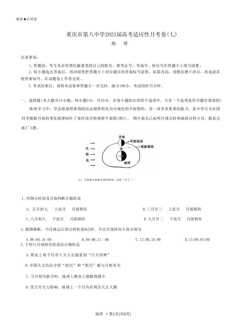 高三地理--重庆市第八中学高2023届高考适应性月考卷(七)