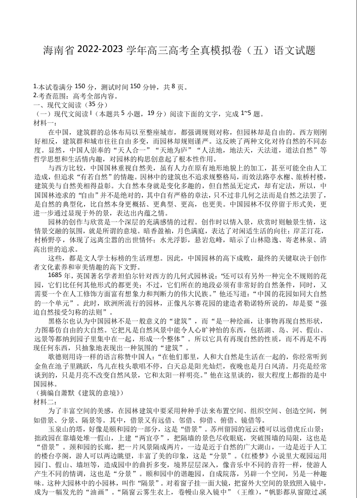 高三语文+答案--海南省2022-2023学年高三高考全真模拟卷(五)