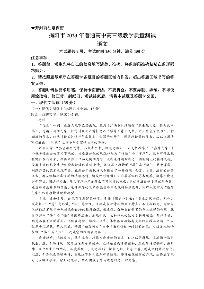 高三语文+答案--广东省揭阳市2023高三上学期期末教学质量监测(一模)