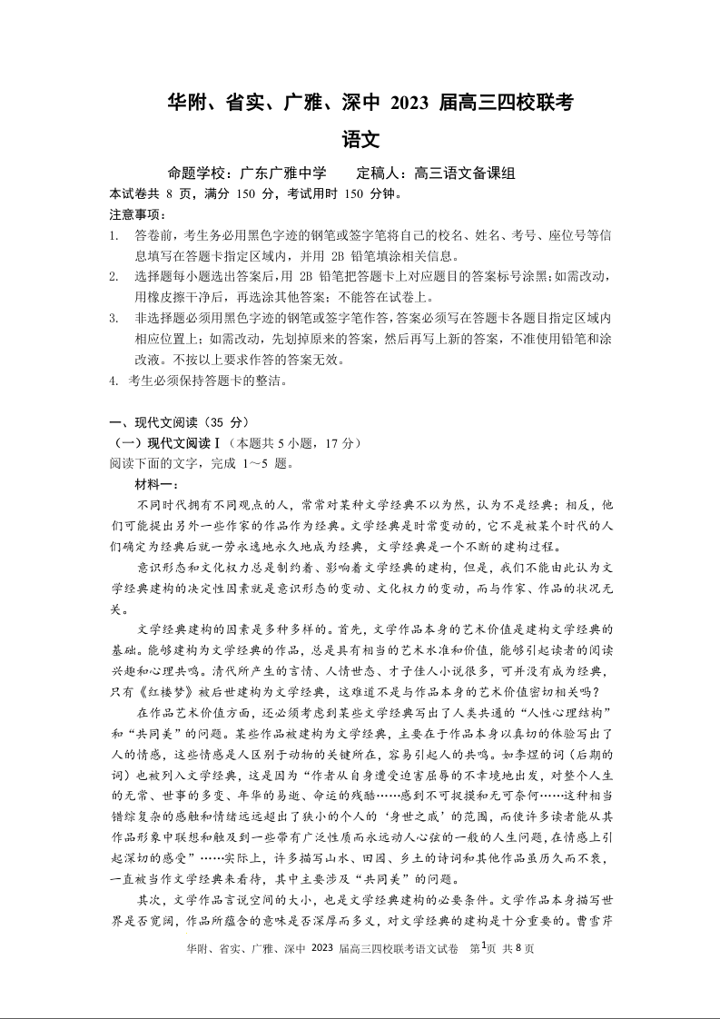 高三语文--广东省华附、省实、广雅、深中2023届高三四校联考
