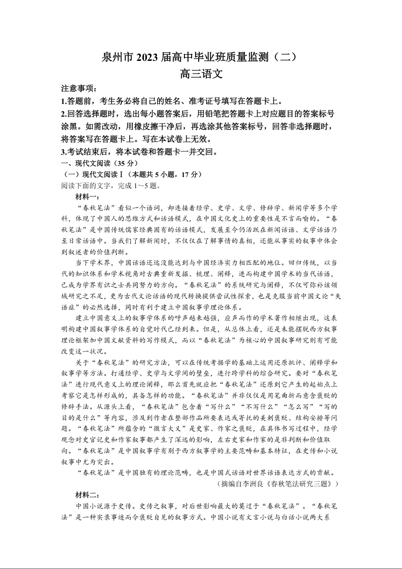 高三语文+答案--福建省泉州市2023高中毕业班质量监测(二)
