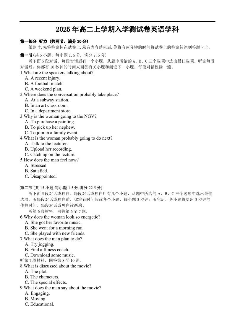 高二英语--湖南省岳阳市颐华高级中学(平江)2025-2026学年高二上学期入学考试
