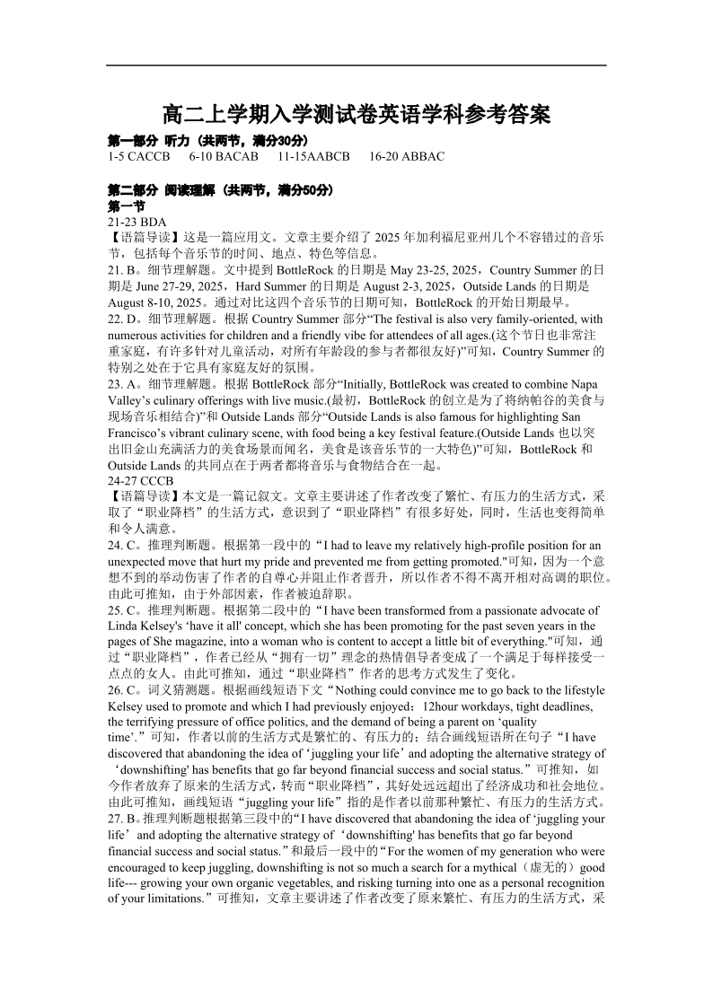 高二英语答案--湖南省岳阳市颐华高级中学(平江)2025-2026学年高二上学期入学考试