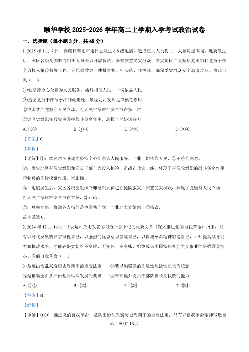 高二政治(精品解析版)--湖南省岳阳市颐华高级中学(平江)2025-2026学年高二上学期入学考试