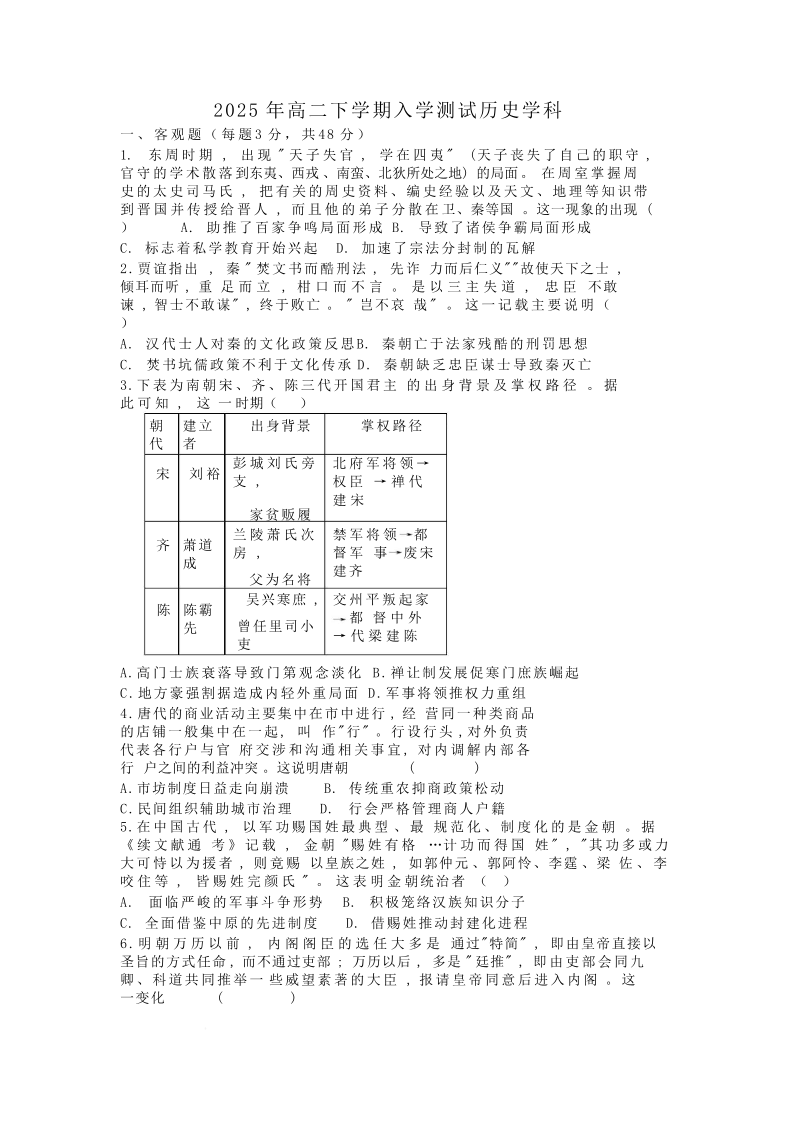 高二历史--湖南省岳阳市颐华高级中学(平江)2025-2026学年高二上学期入学考试