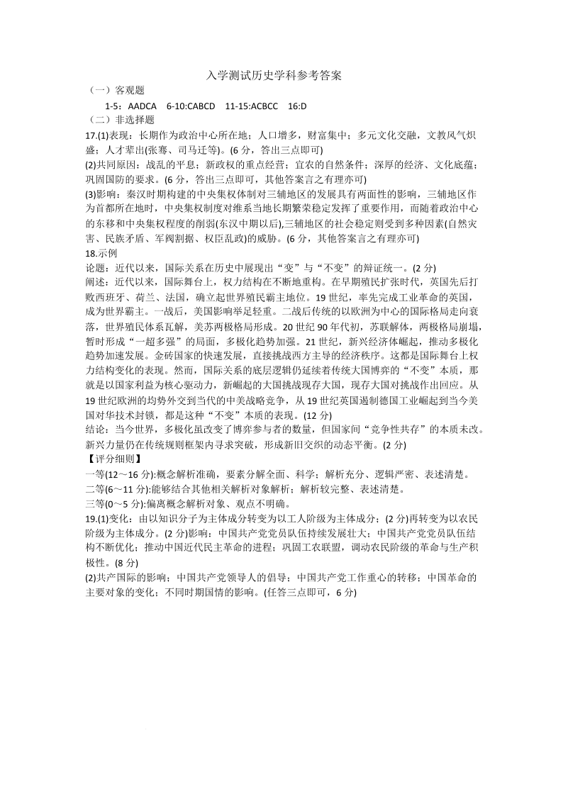 高二历史答案--湖南省岳阳市颐华高级中学(平江)2025-2026学年高二上学期入学考试