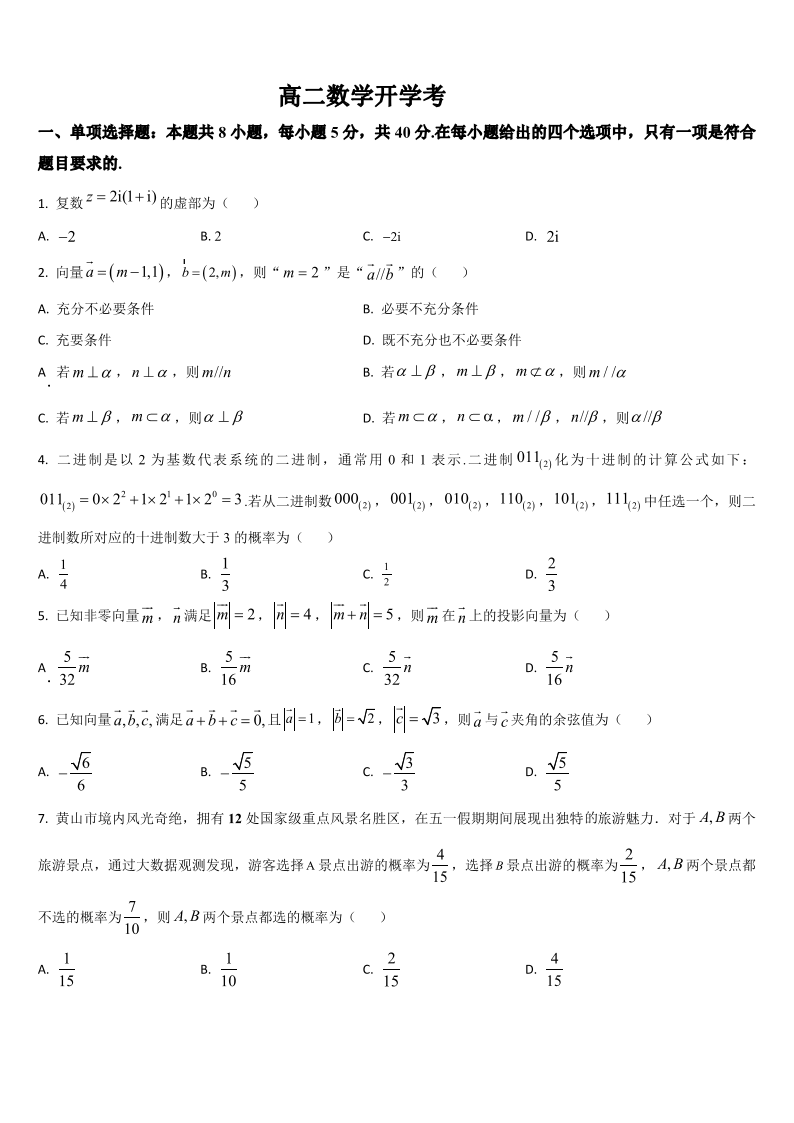 高二数学+答案--吉林省通化市梅河口市第五中学2025-2026学年高二上学期开学考试