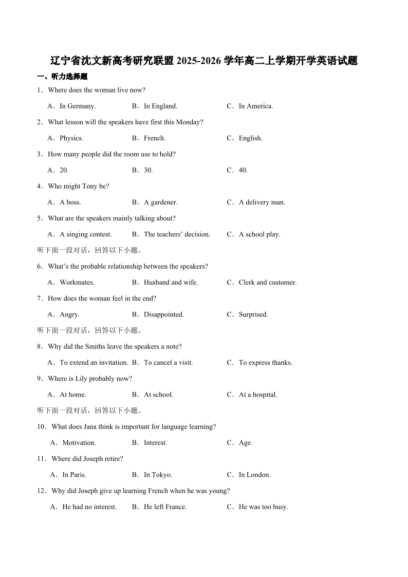 高二英语+答案--辽宁省沈文新高考研究联盟2025-2026学年高二上学期开学质量监测