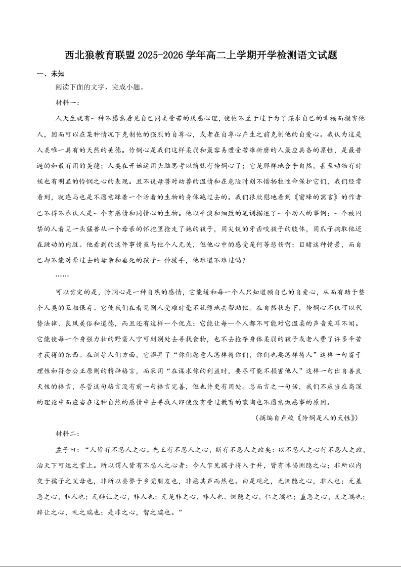 高二语文+答案--重庆市西北狼教育联盟2025-2026学年高二上学期开学学情诊断