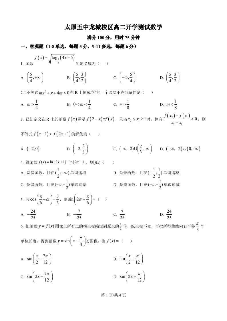 高二数学(原卷版)--山西省太原市第五中学校2025-2026学年高二上学期开学