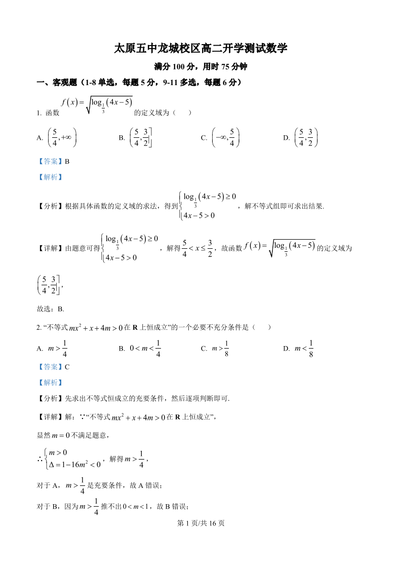 高二数学(精品解析版)--山西省太原市第五中学校2025-2026学年高二上学期开学