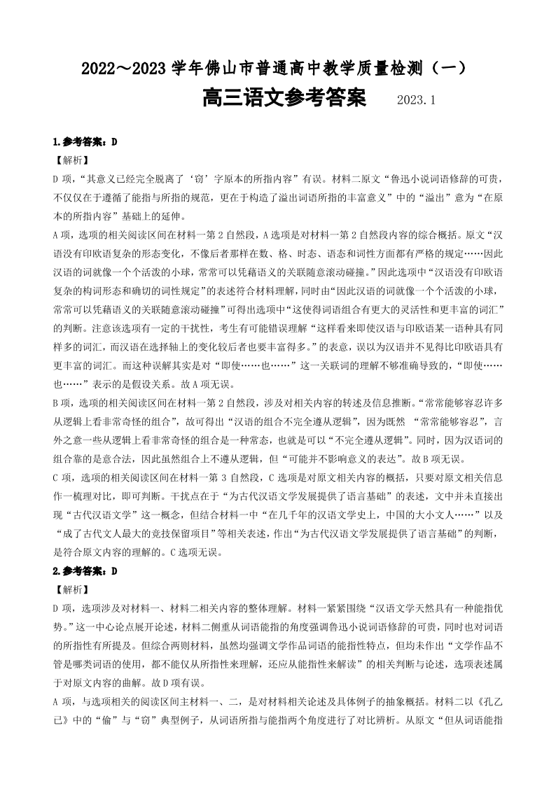 高三语文答案--广东省佛山市2022-2023学年高三上学期教学质量检测(一)