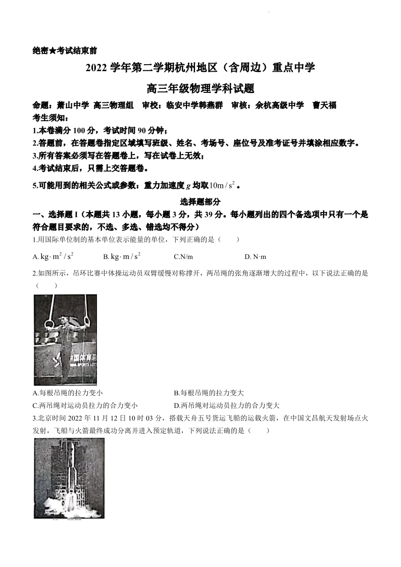 高三物理+答案--浙江省杭州(含周边)重点中学2023届高三下学期3月联考