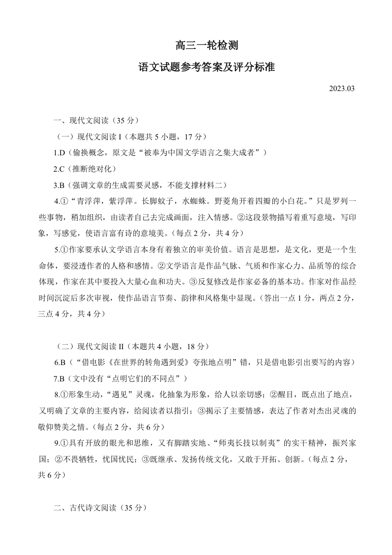高三语文答案--山东省泰安市2023高三下学期3月一模