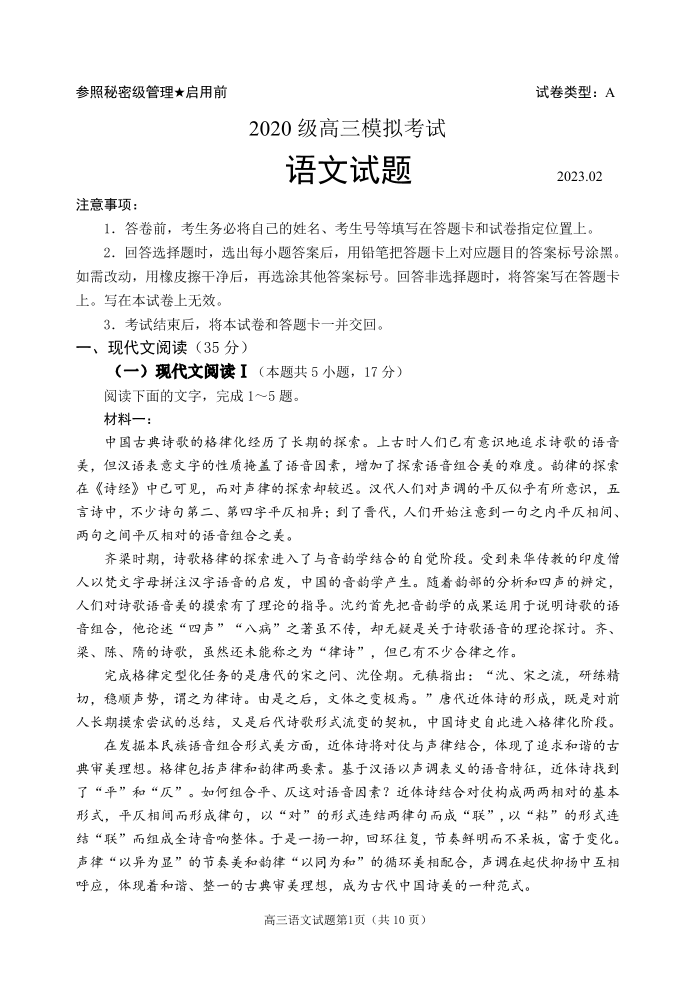 高三语文--山东省日照市2023届高三上学期一模考试