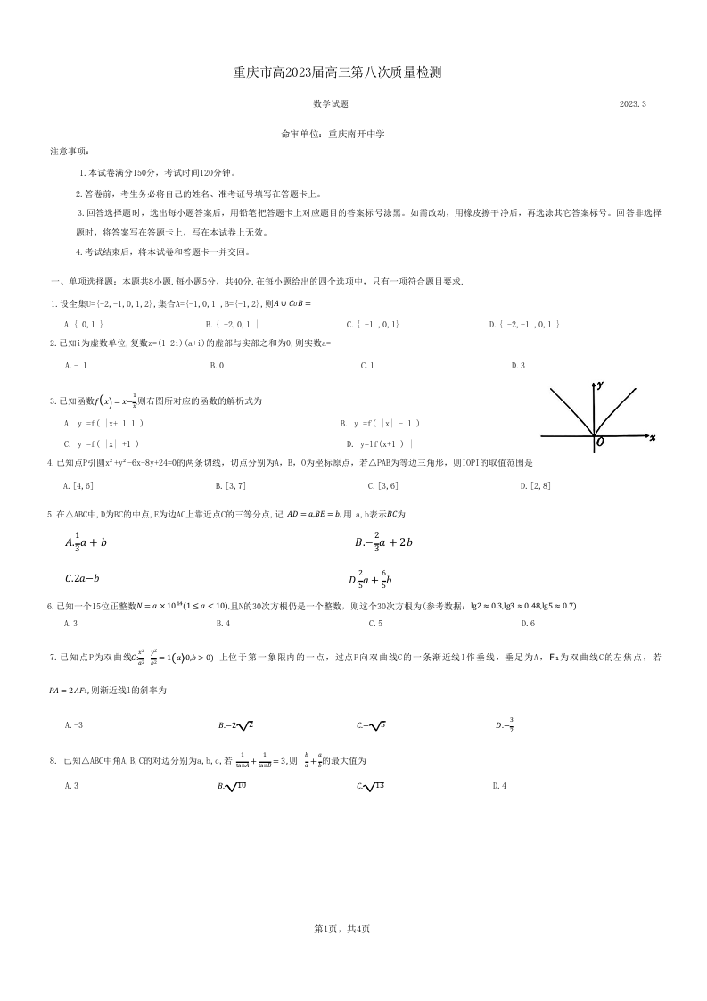 高三数学--重庆市南开中学高2023届高三第八次质量检测