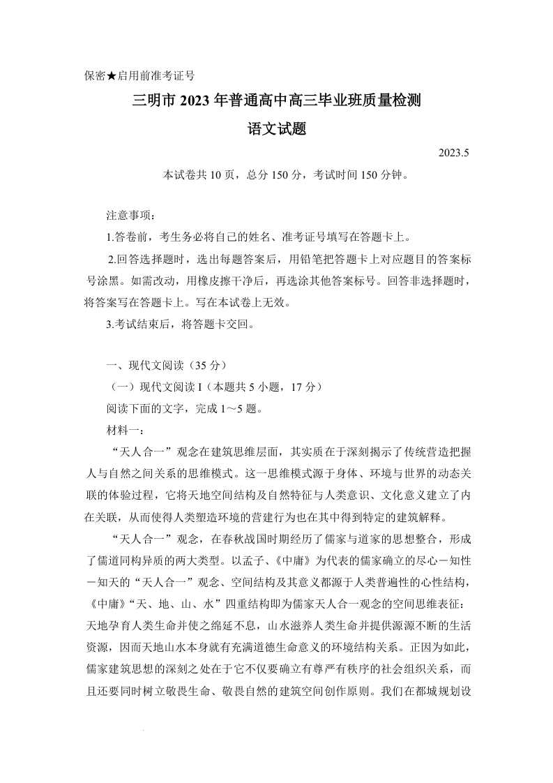 高三语文--福建省三明市2023届普通高中高三下学期5月份质量检测